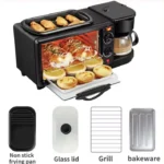 - This breakfast machine 3 in 1 combines the three functions of a toaster oven, a coffee machine and a baking tray, allowing you to cook coffee, grill sausages, fried eggs, etc. while making breakfast in the morning.