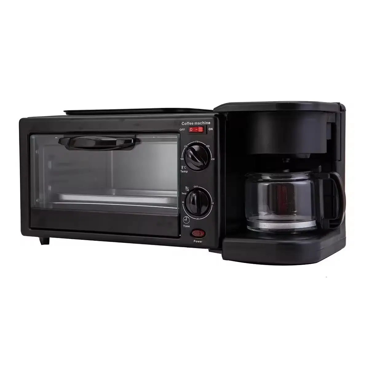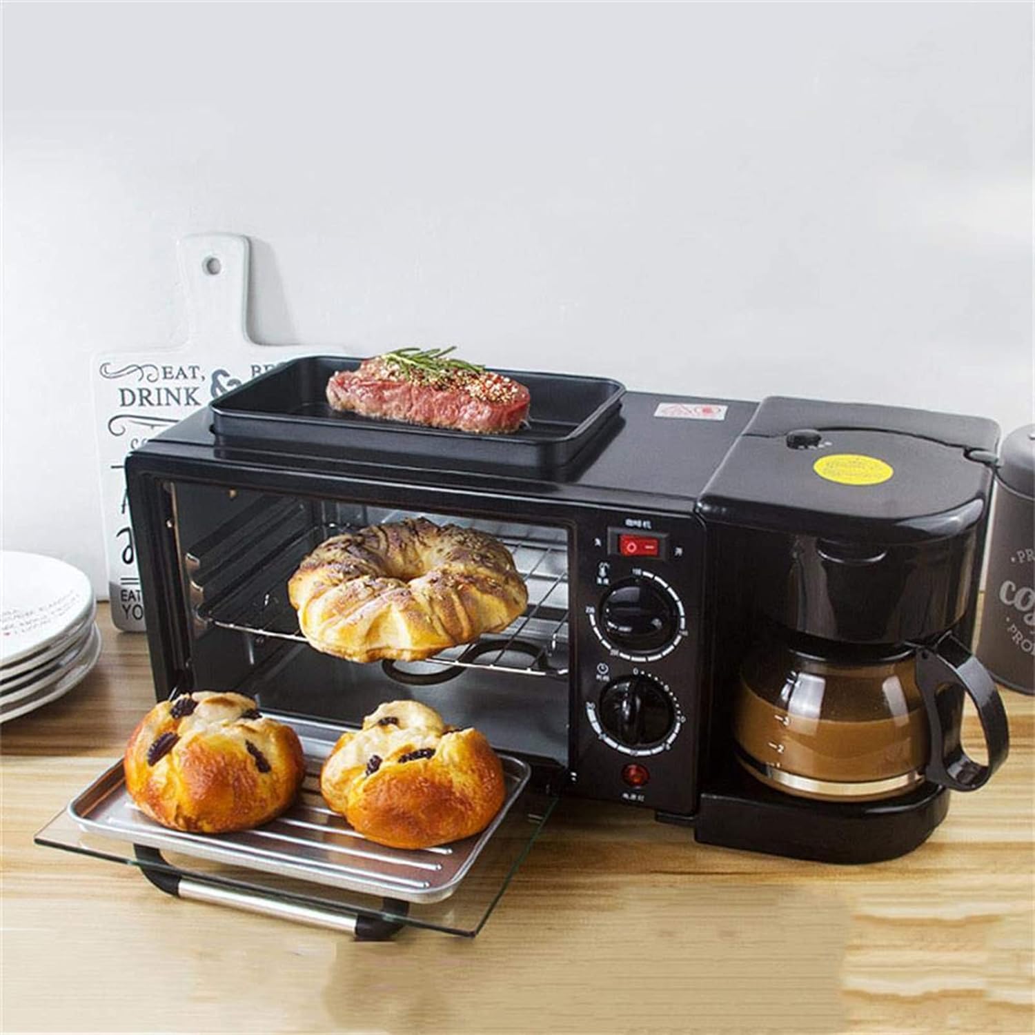 - This breakfast machine 3 in 1 combines the three functions of a toaster oven, a coffee machine and a baking tray, allowing you to cook coffee, grill sausages, fried eggs, etc. while making breakfast in the morning.