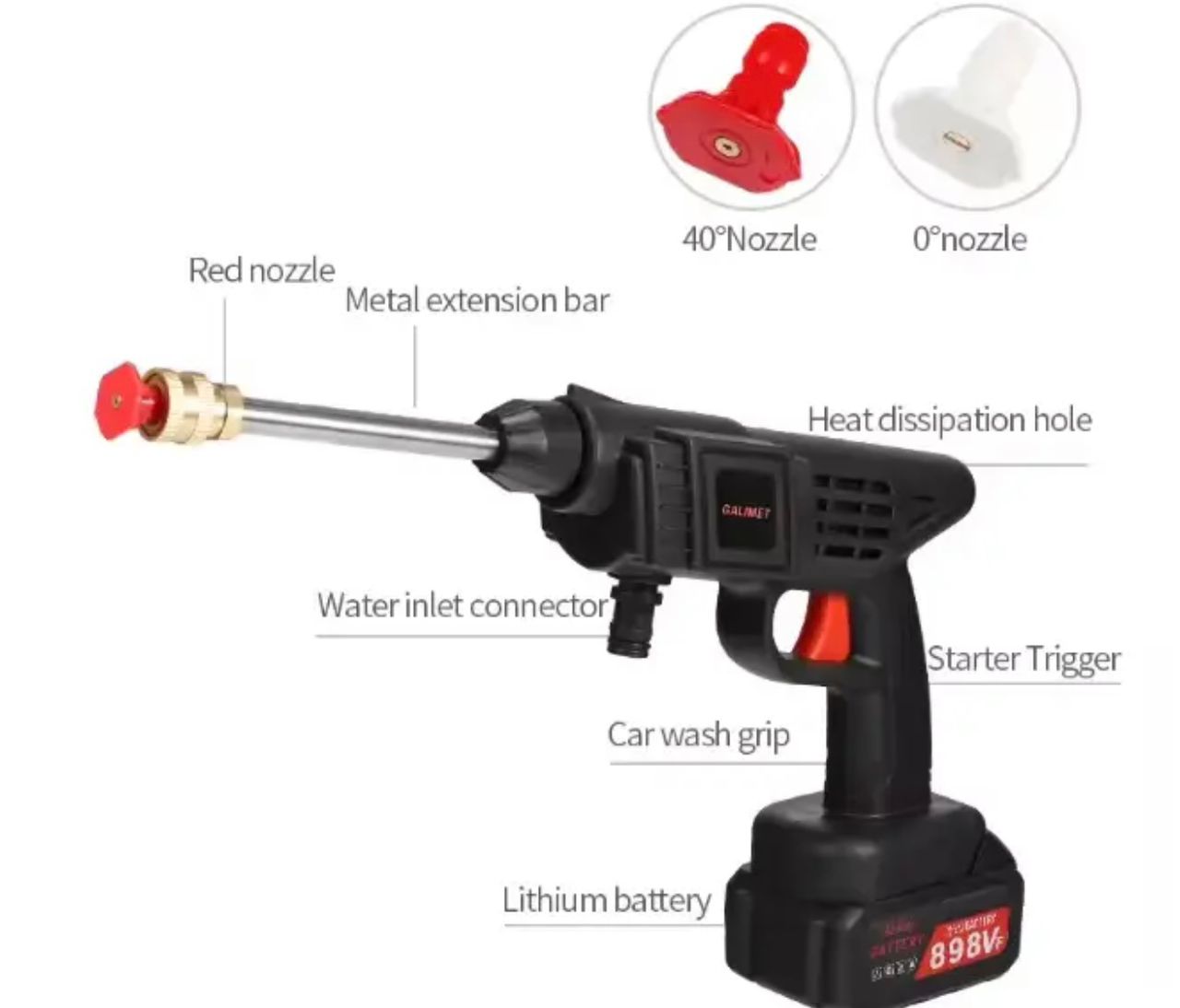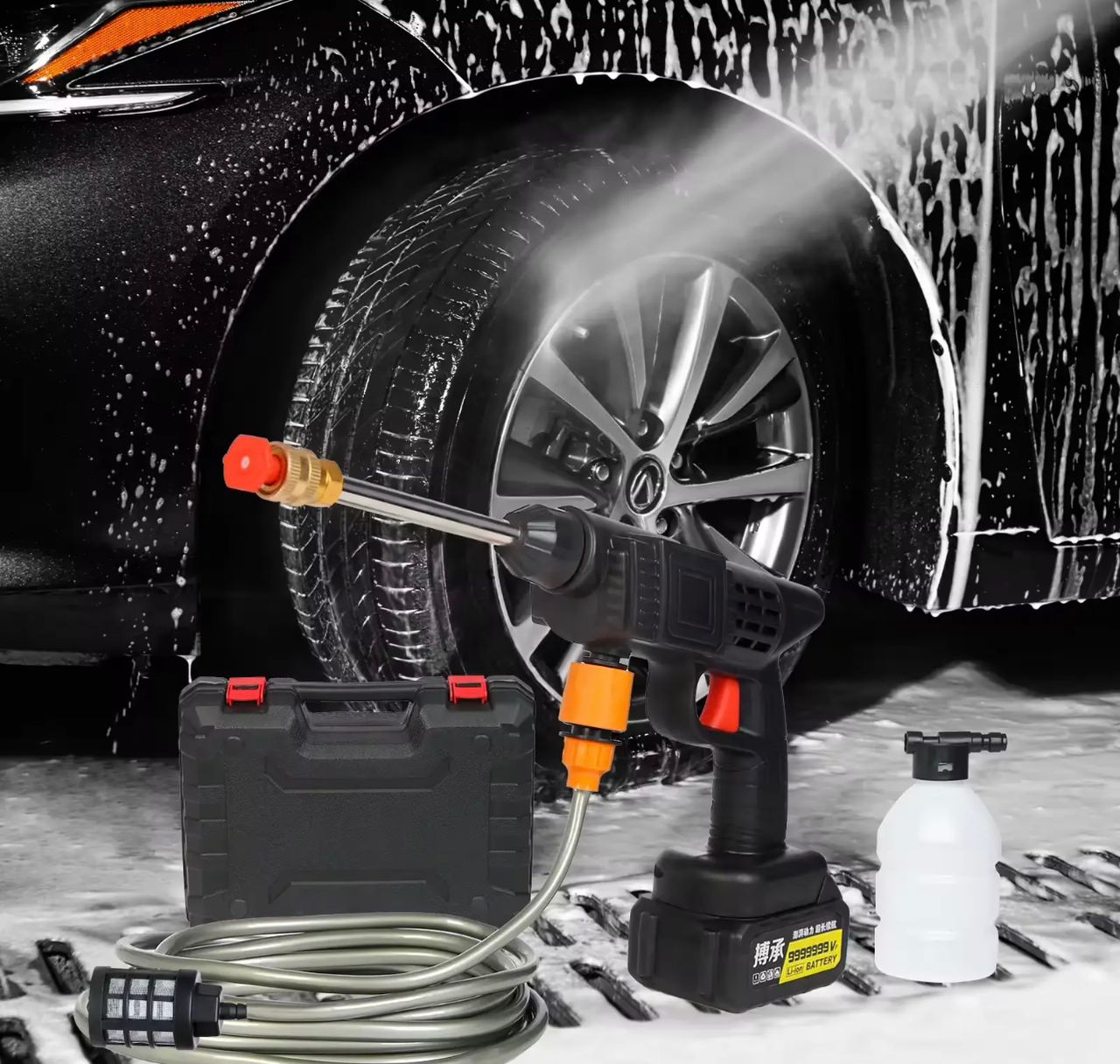 Large pressure, small volume, flexible use, comes with lithium battery, foam pot, not limited by the concept of power, improve the self-service car wash experience the product can be carried with the car, available anytime, anywhere, for you to save valuable time.