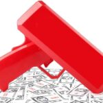 - Simply insert four AA batteries into the right side of the cannon. Remove the top cover, deposit the cash into the loading compartment, set the money gun cover down, adhere it to the cash, and then slowly squeeze the trigger. Make sure the goods are disbursed in the direction you intend. (The money may pile up and not come out well if the money pistol is fired downward.)